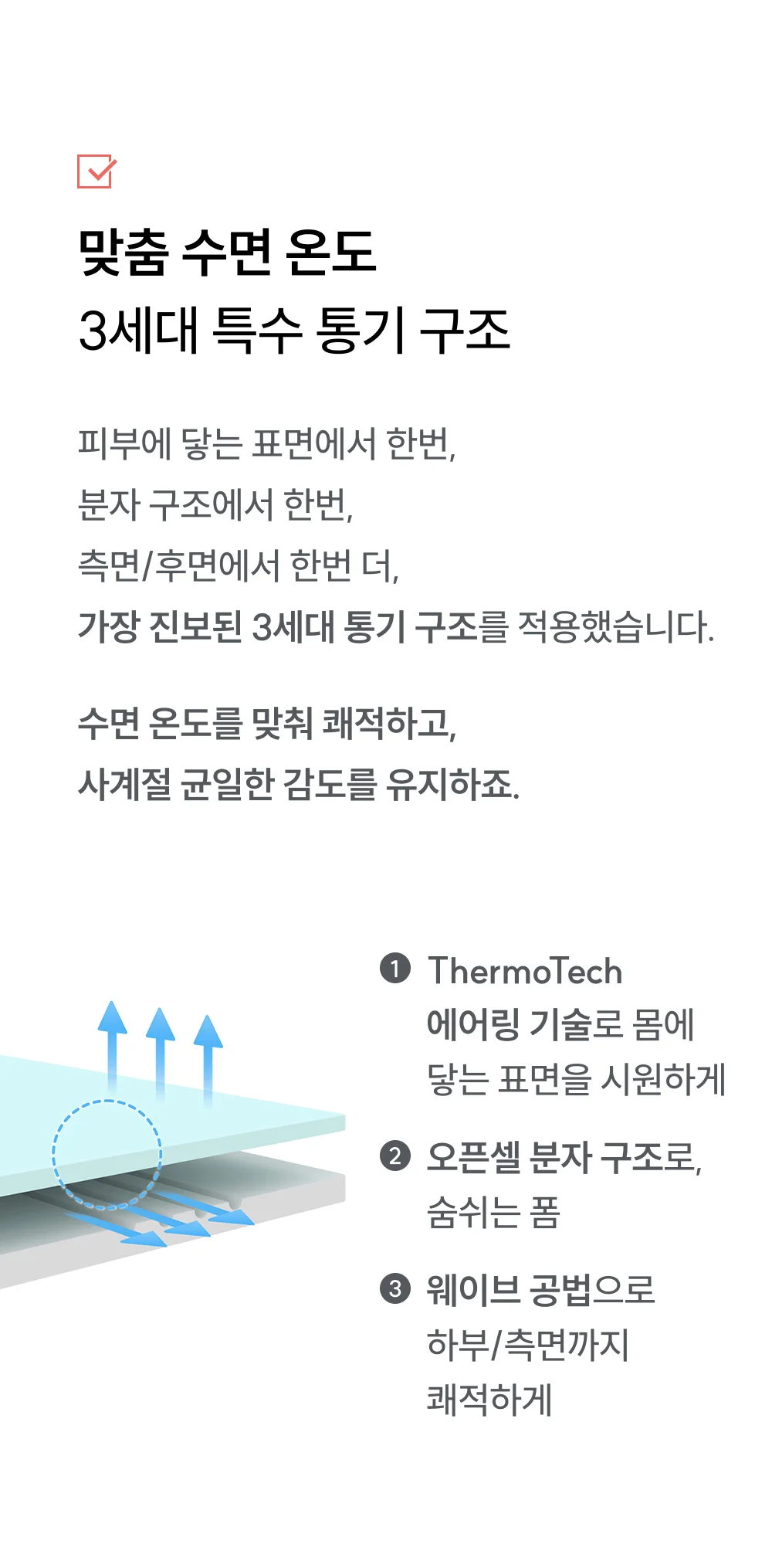 수면에 최적화된 온도를 유지하기 위해 3세대 통기 구조를 적용했습니다. ThermoTech 에어링 기술이 표면을 시원하게 하고, 에어셀 메모리폼의 오픈셀 분자 구조가 숨을 쉬며 쾌적함을 극대화합니다. 또한 라텍스와 달리 열과 수분에 강해 전기장판 등 온열 기기와도 호환되어 실용적입니다. (단, 낮은 온도 사용 권장)