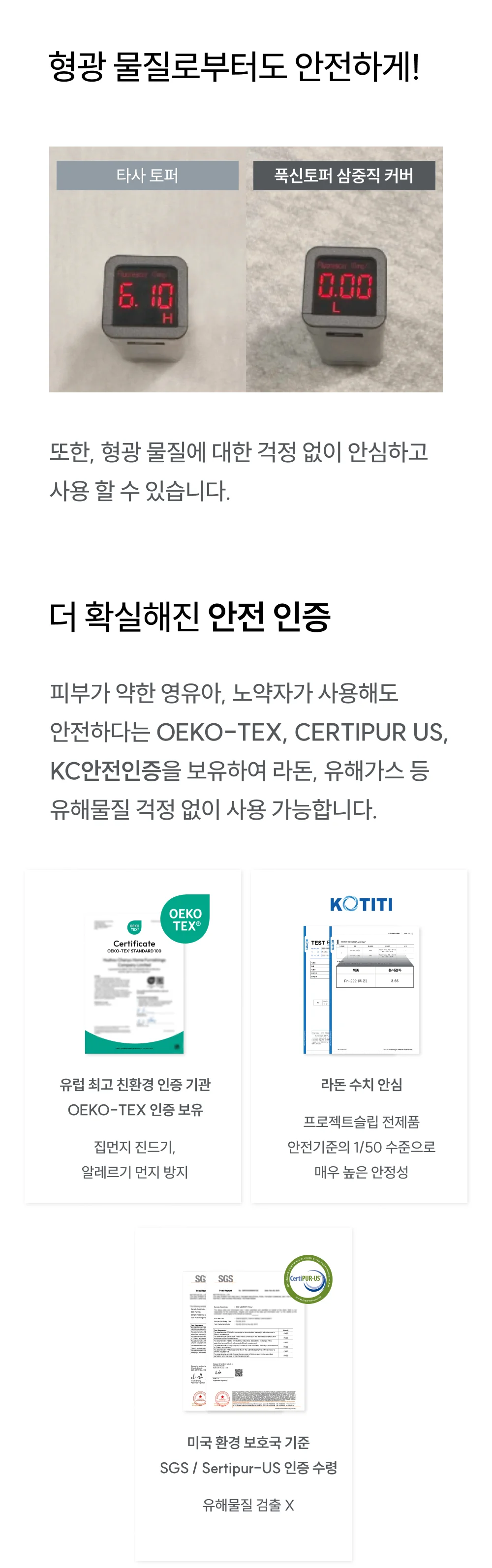 안전 인증 마크: 피부에 직접 닿는 만큼 라돈 등 유해 물질로부터 안전한지(Oeko-tex, CertiPUR-US 등) 확인은 필수입니다.