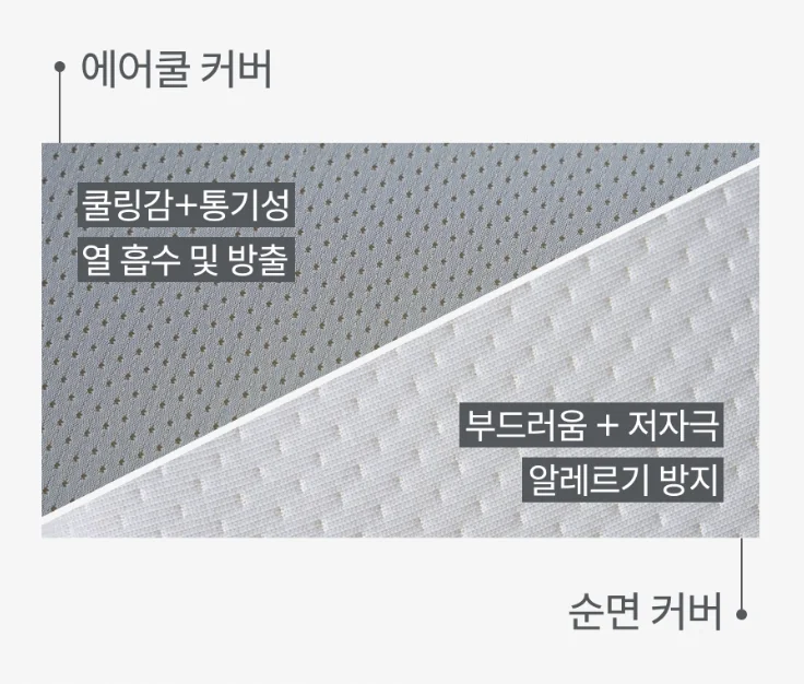 커버 쾌적성 | 🔺 땀이 잘 차고 열 방출 취약 | 🔺 일반 단일 소재 커버 | ⭕ 에어쿨(중앙) + 순면(사이드) 듀얼 적용 |