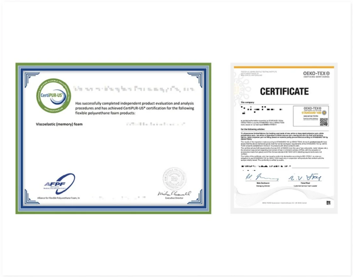 안전성 (글로벌 인증) | ❌ 미인증 저가 제품 주의 | 🔺 일반적인 국내 인증 수준 | ⭕ CertiPUR-US & OEKO-TEX 1등급 |