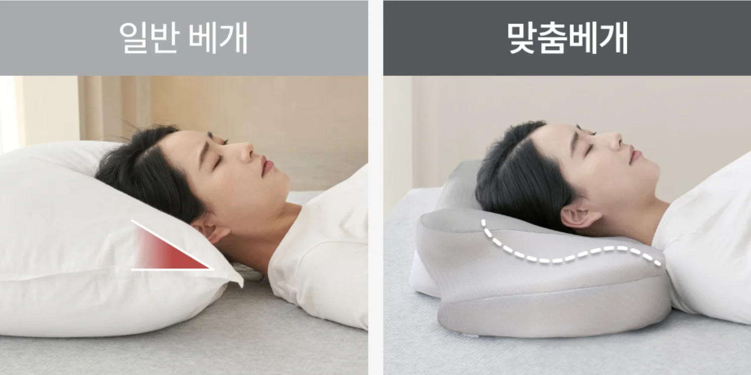 지지력 없이 푹 꺼지는 솜베개나 일자형/계단형 베개는 수면 자세를 붕괴시켜 코골이와 어깨 말림, 목 디스크를 유발합니다.
