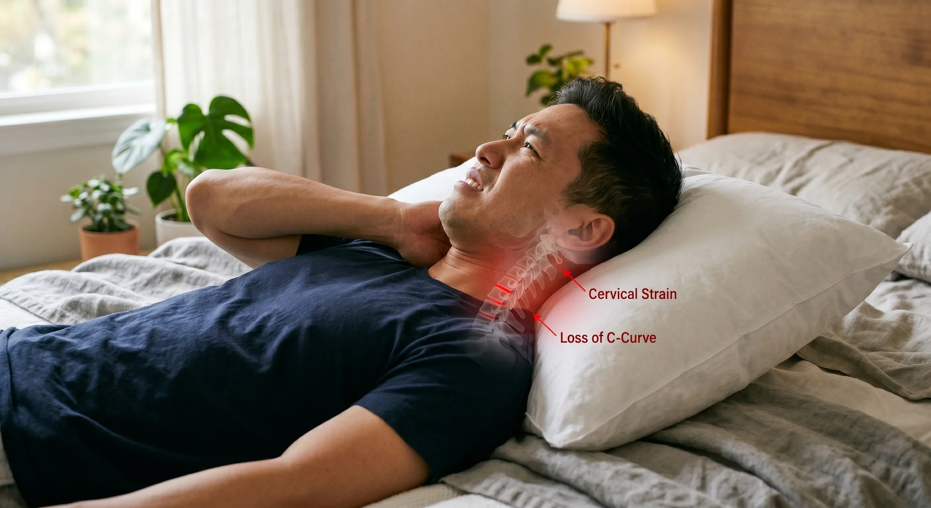 목 뒤쪽 근육과 인대를 밤새 팽팽하게 잡아당겨 아침에 극심한 뻐근함을 유발합니다.