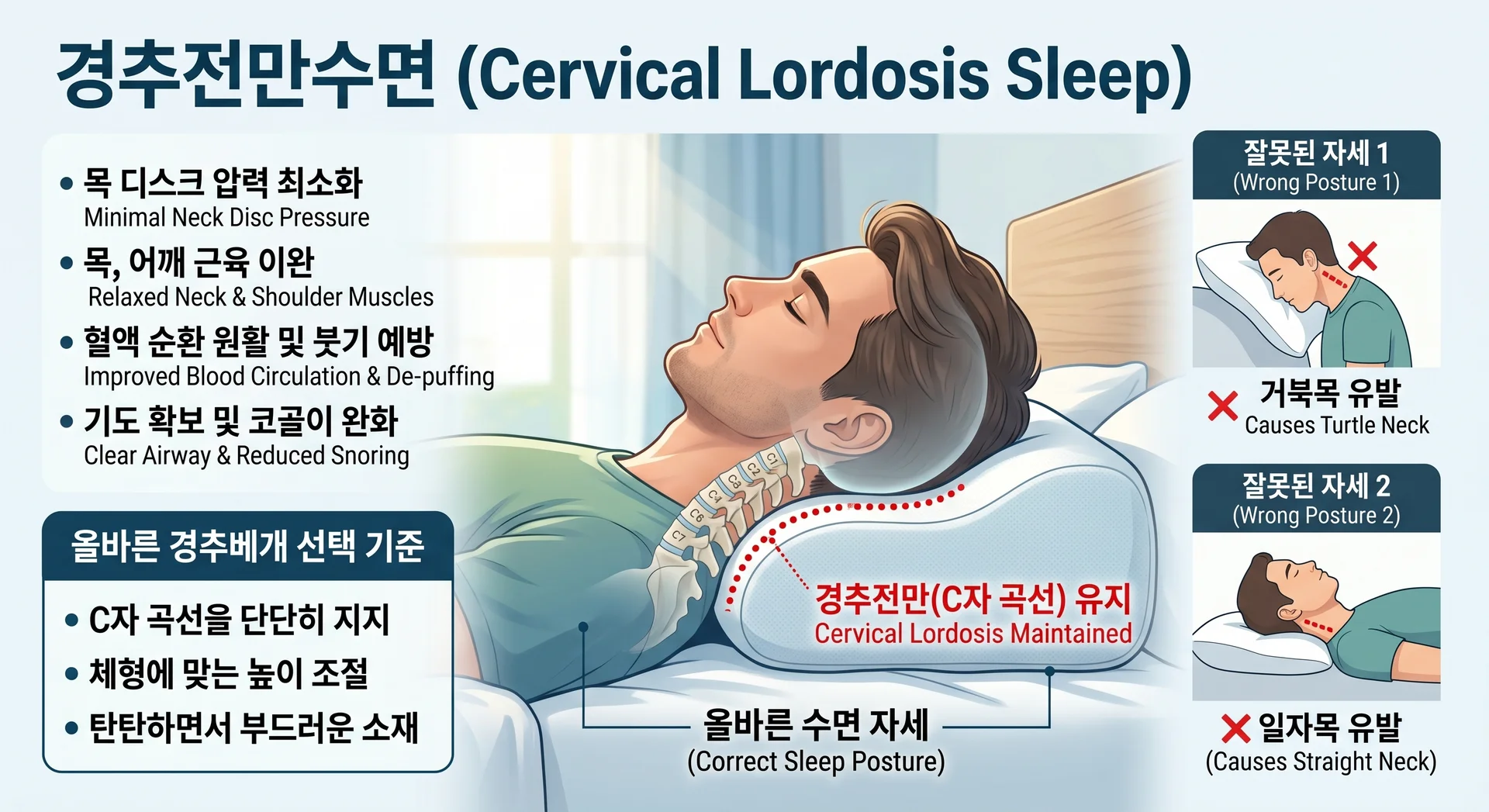 근육 및 인대의 완전한 이완: 깨어 있을 때는 근육이 머리를 지탱하지만, 잠들면 근육이 완전히 이완됩니다. 이때 C자 곡선이 유지되어야 낮 동안 굳어있던 목덜미와 승모근의 긴장이 풀립니다.