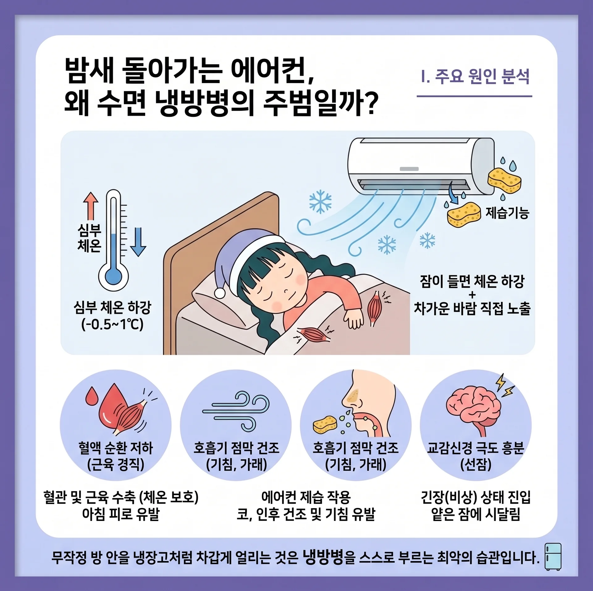 우리 몸은 잠이 들면 심부 체온(신체 내부 온도)이 평소보다 약 0.5~1℃ 자연스럽게 떨어집니다. 이 취약한 상태에서 차가운 에어컨 바람이 직접 닿으면 심각한 문제가 연쇄적으로 발생합니다.